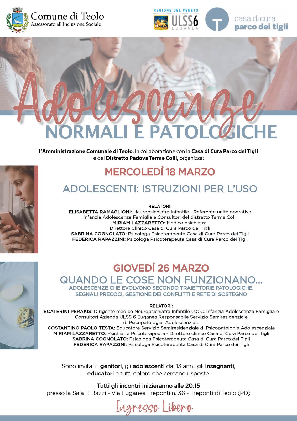 Per aiutare famiglie, insegnanti ed educatori a orientarsi in una fase di vita tanto delicata quanto complessa, il Comune di Teolo, in collaborazione con la Casa di Cura Parco dei Tigli e il Distretto Padova Terme Colli (ULSS 6 Euganea), organizza due incontri pubblici dedicati al tema Adolescenze normali e patologiche.